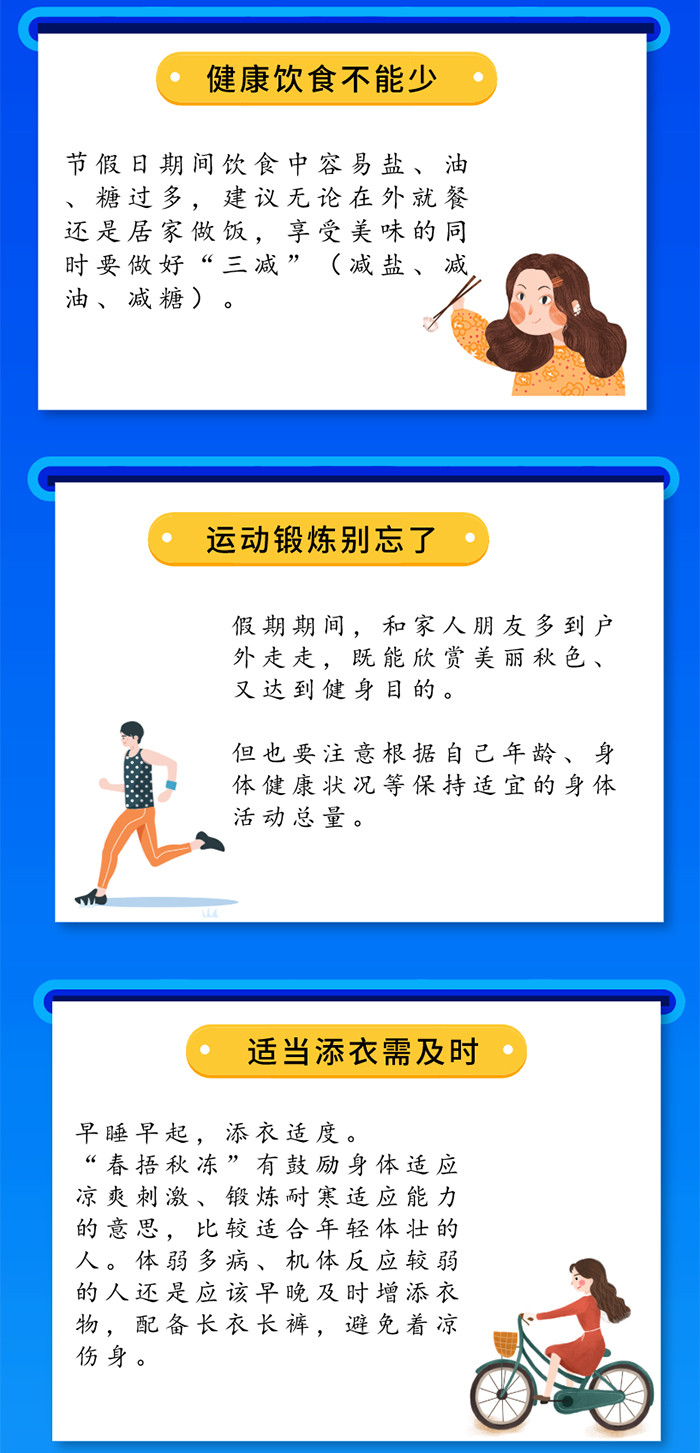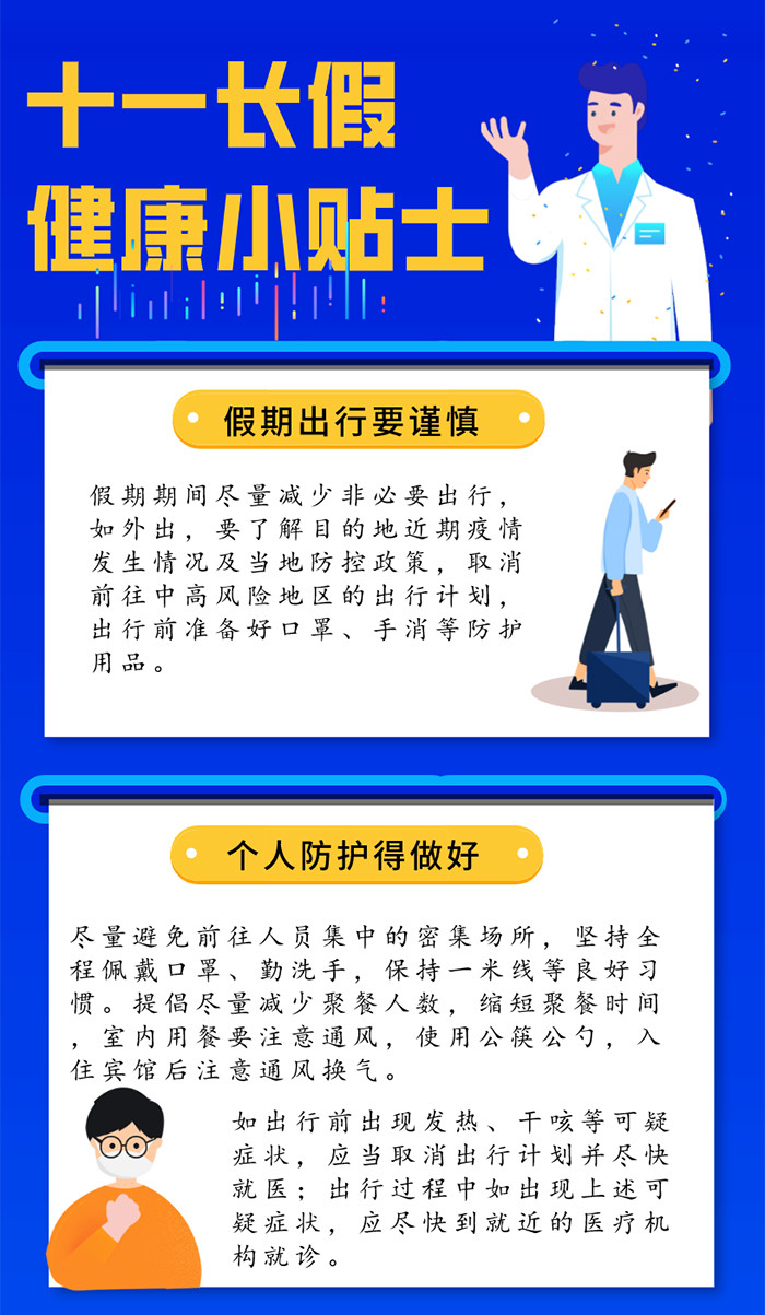 國慶假期到來,各地將迎來旅游出行和探親訪友高峰期。為平安健康地享受秋高氣爽好時節以及親友歡聚好時光,這份國慶假期健康小貼士送給您!