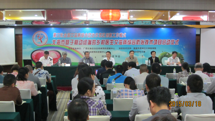 根據《第三輪全國艾滋病綜合防治示范區工作方案》要求,結合當地防艾工作實際,“北海市基于移動終端的鄉村醫生艾滋病綜合防治技術項目”--示范區艾滋病防治創新工作模式,于2015年3月18日在北海市順利啟動。中國疾控中心性艾中心副主任汪寧、廣西自治區防艾辦宣傳干預處副處長陸慶林、美國韋恩州立大學醫學院兒童研究中心主任李曉銘、自治區疾控中心艾防所所長沈智勇,北海市各級防艾辦、疾控中心防艾工作人員,各鄉鎮衛生院院長、防保科長以及部分村村醫生共計200人參加項目啟動培訓班。