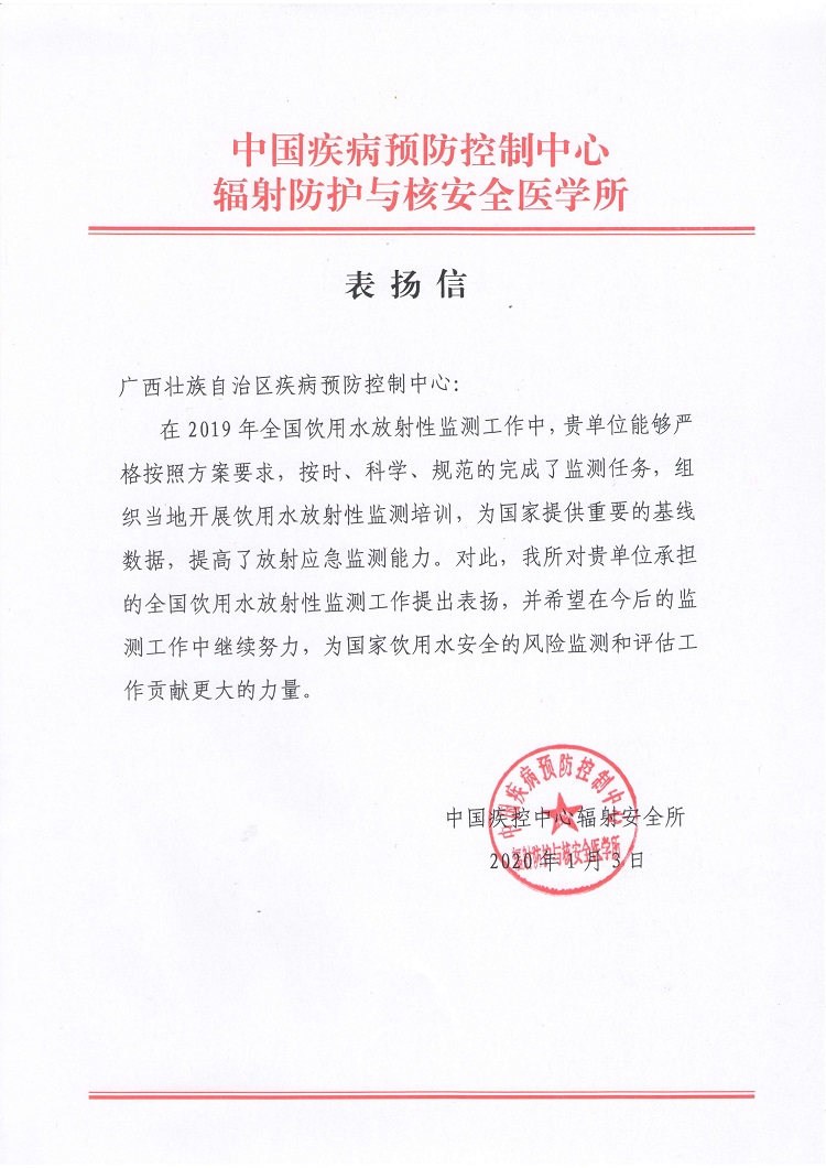 廣西壯族自治區疾病預防控制中心在2019年全國飲用水放射性監測工作中,能夠嚴格按照國家監測方案要求,按時、科學、規范地完成了監測工作,組織當地開展飲用水放射性監測培訓,為國家提供了重要基線數據,風險評估分析能力突出,提高了飲用水放射應急監測能力。中國疾控中心輻射安全所發來表揚信,對我中心承擔的飲用水放射性污染風險監測工作提出表揚。