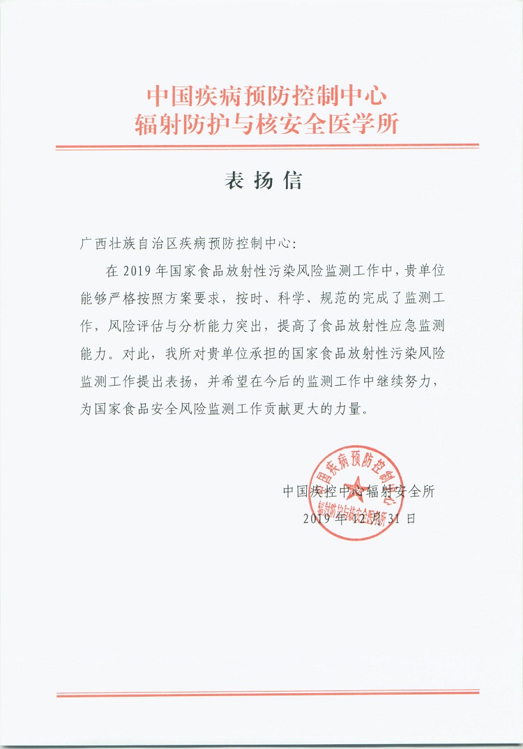 無獨有偶,自治區疾控中心在2019年全國食品放射性風險監測工作中,也獲得肯定,中國疾控中心輻射所也發來表揚信。