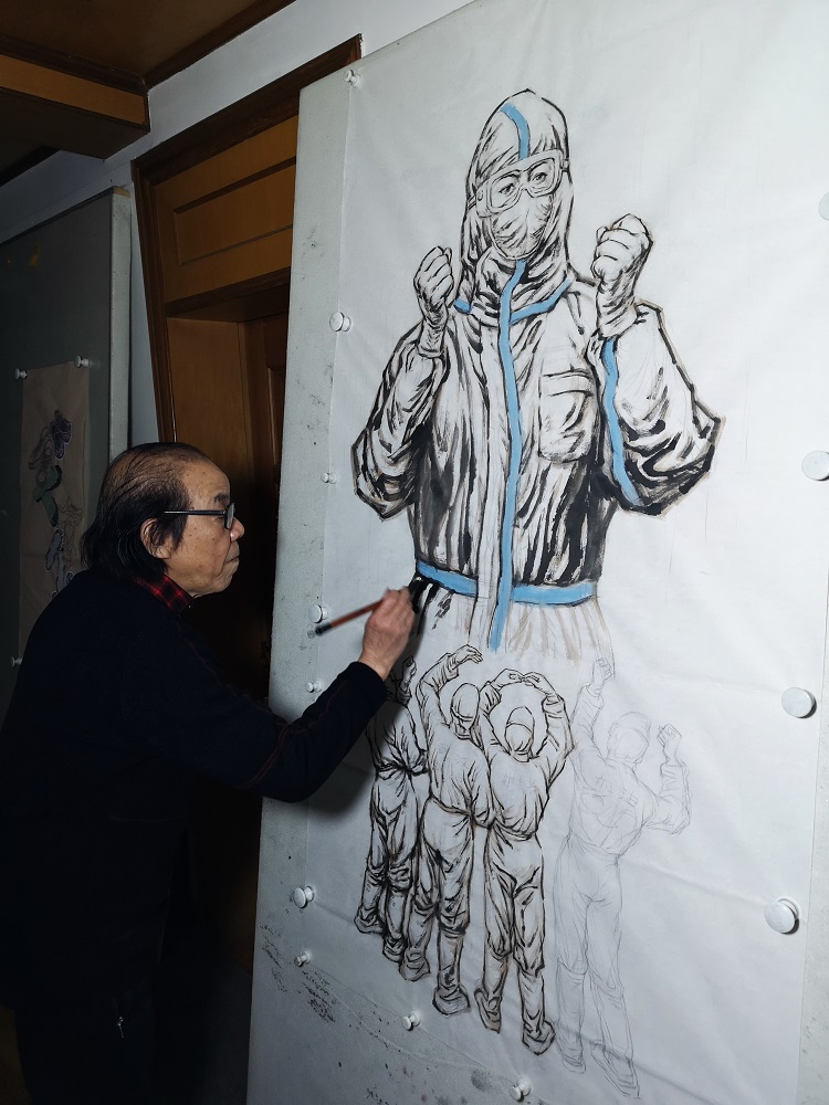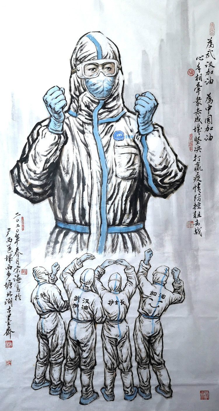 “我雖然退休了,不能參與一線的疫情防控工作,但仍希望發揮所長,盡自己的微薄力量。”黃宗海是中國美術家協會會員、廣西中國畫學會常務理事、中央美術學院中國畫國內訪問學者,退休后仍活躍在中國畫壇。老驥伏櫪,志在千里。烈士暮年,壯心不已。作為一名退休的共產黨員,一名疾控人,一名畫家,面對這次疫情,黃宗海有感于抗擊疫情中各種各樣的先進事跡和先進人物,毅然拿起手中的筆,以最快速度僅用兩天時間創作出大幅中國畫《為武漢加油!為中國加油!》。該畫高180厘米,寬97厘米,畫面形象生動,色彩鮮明,寓意直白,以一位穿著密不透風的防護服的醫護人員為主體形象,描繪在疫情救治、防控第一線、迎難而上的醫護人員,為武漢加油!為中國加油!